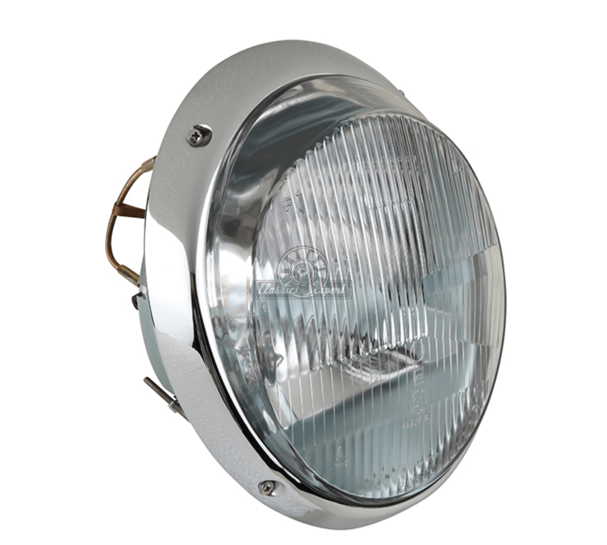 Reflektor Lewy/Prawy (z przezroczystym szkłem, chromowaną obwódką, żarówki 2xH1 i śruby mocujące, H1 / H1, ze znakiem E) do Porsche 911, 912 (63-73, 72-73)