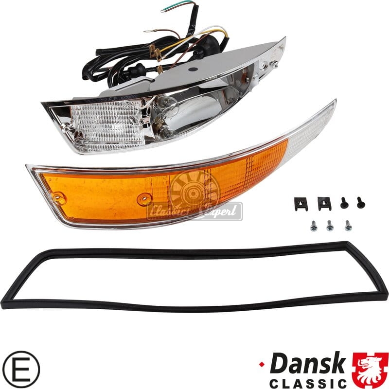 Kierunkowskaz przedni, kompletny z obudowa metalowa, ze znakiem E, lewy