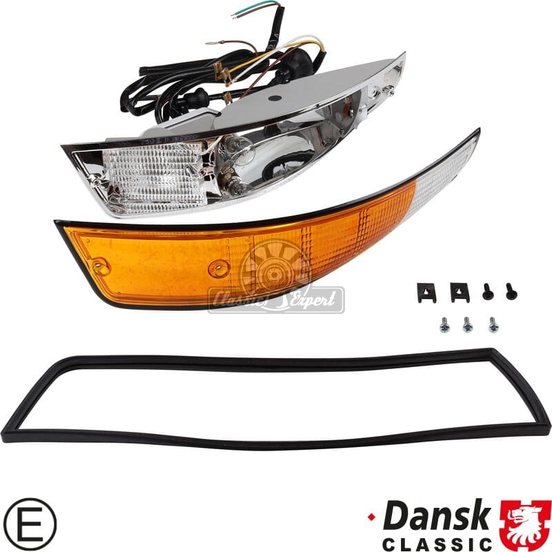 Kierunkowskaz z czarna obwodka, przod, kompletny z obudowa metalowa, z oznaczeniem E, lewy
